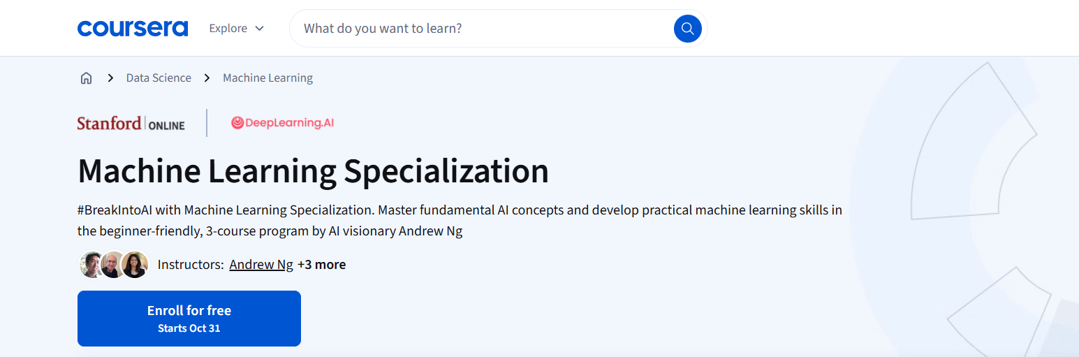 A beginner-friendly Coursera program by Andrew Ng that teaches how to build and train ML models using Python, NumPy, and TensorFlow, covering regression, classification, clustering, and neural networks.